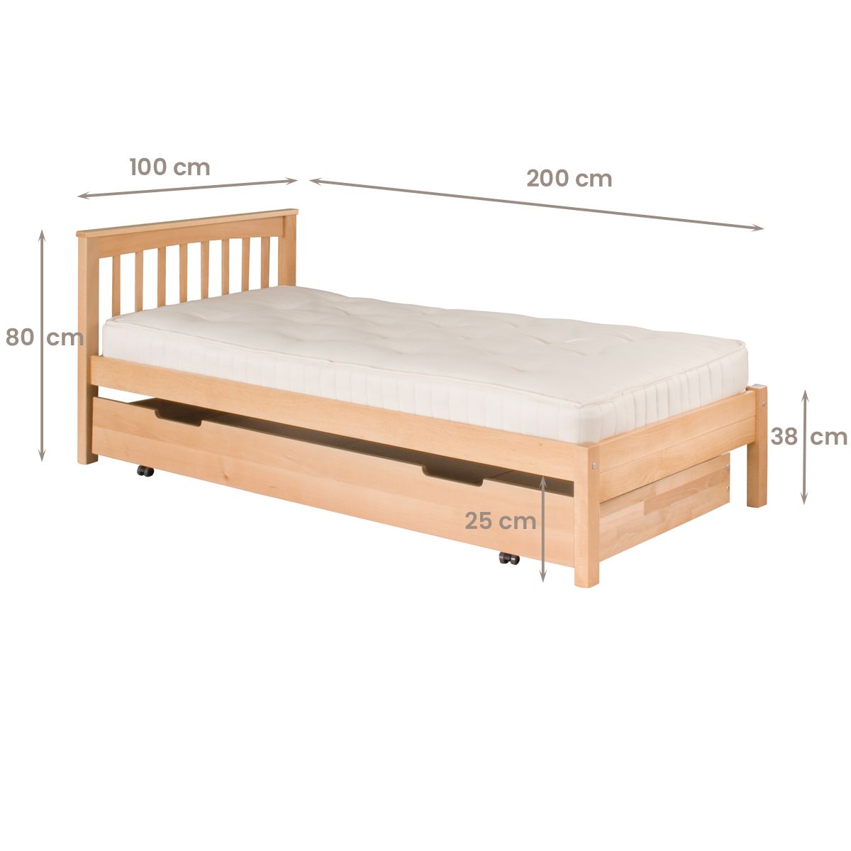 . Learn moreOur Scandinavian-inspired Natural Beech Single Bed with Trundle is crafted from solid beech hardwood (no soft, knotty painted pine!) highlighting the natural beauty of real wood with a clear lacquer finish. Each bed showcases unique grain variations, making every piece one of a kind. Built to an exceptional specification, this single bed is undeniably strong and durable, with solid hardwood frames and a low foot end for a contemporary feel that lends itself to both traditional and modern interiors alike. The space-saving roll-out trundle offers flexible functionality: use it as a roomy storage drawer or add a trundle mattress for an instant sleepover solution. Pair this bed with our handcrafted children’s spring interior mattresses for optimal support and comfort.