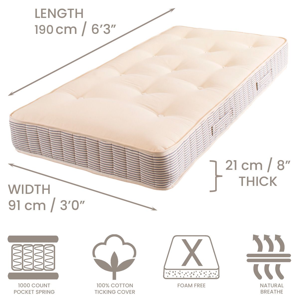 Our premium Pocket Sprung Mattress, made to fit a full‑size single bed, delivers exceptional comfort with 608 individually pocketed springs that respond to the body for balanced support. Each mattress is hand‑crafted in rural Wiltshire, with meticulous attention to detail.