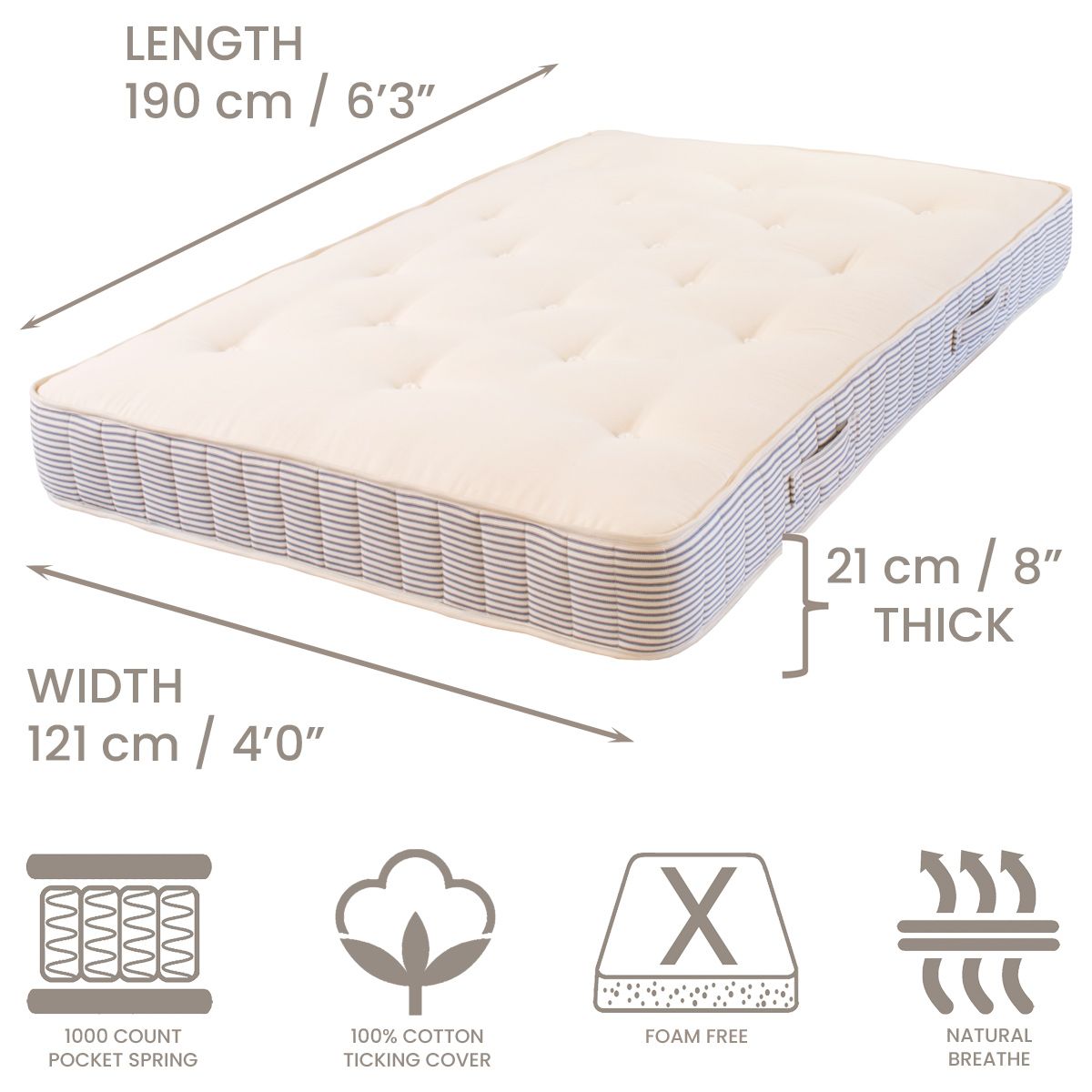Our premium Small Double Pocket Sprung Mattress, crafted to perfectly fit our small double bed, is designed for exceptional comfort and long‑lasting support. Inside are 810 individually pocketed springs, each sewn into its own fabric casing to maintain optimal support throughout the night.